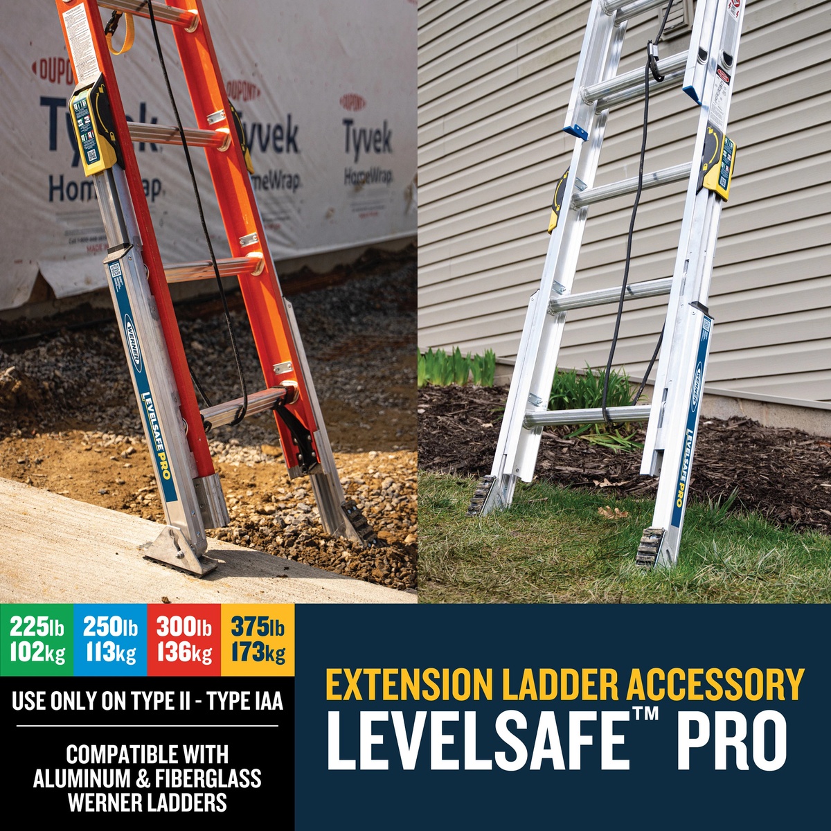 The PK100 LevelSafe Pro is a ladder leveling accessory designed for select Werner extension ladders. It provides up to 8.5 inches of automatic leveling to help set up safely on uneven surfaces, then locks securely in place. Micro-Adjust technology and an included bubble level allow hands-on precision. Package includes two levelers (one per rail), mounting hardware, drill template, and instructions. Compatible with multiple Werner aluminum and fiberglass extension ladder series and maintains the ladder?s duty rating when installed.