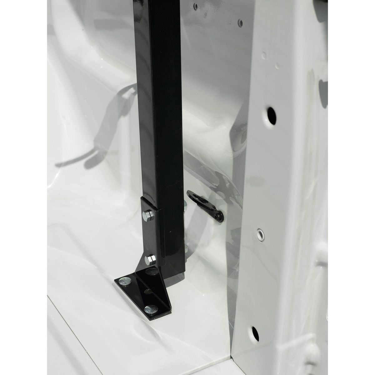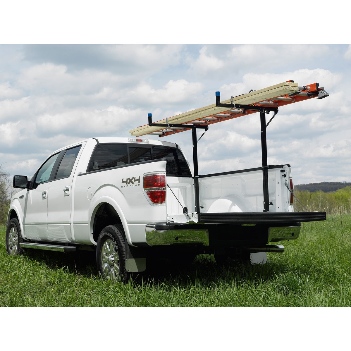 The TR401-S is a black steel rack that mounts to most conventional pickup trucks and removes easily when not needed. Predrilled uprights simplify installation, and included cargo positioners with vinyl strips help secure and protect ladders, lumber and other long materials in transit. The rack expands from 24 to 36 inches wide and features a durable double-layer glossy powder-coated finish with corrosion-resistant hardware. Load capacity: 250 lb, evenly distributed.