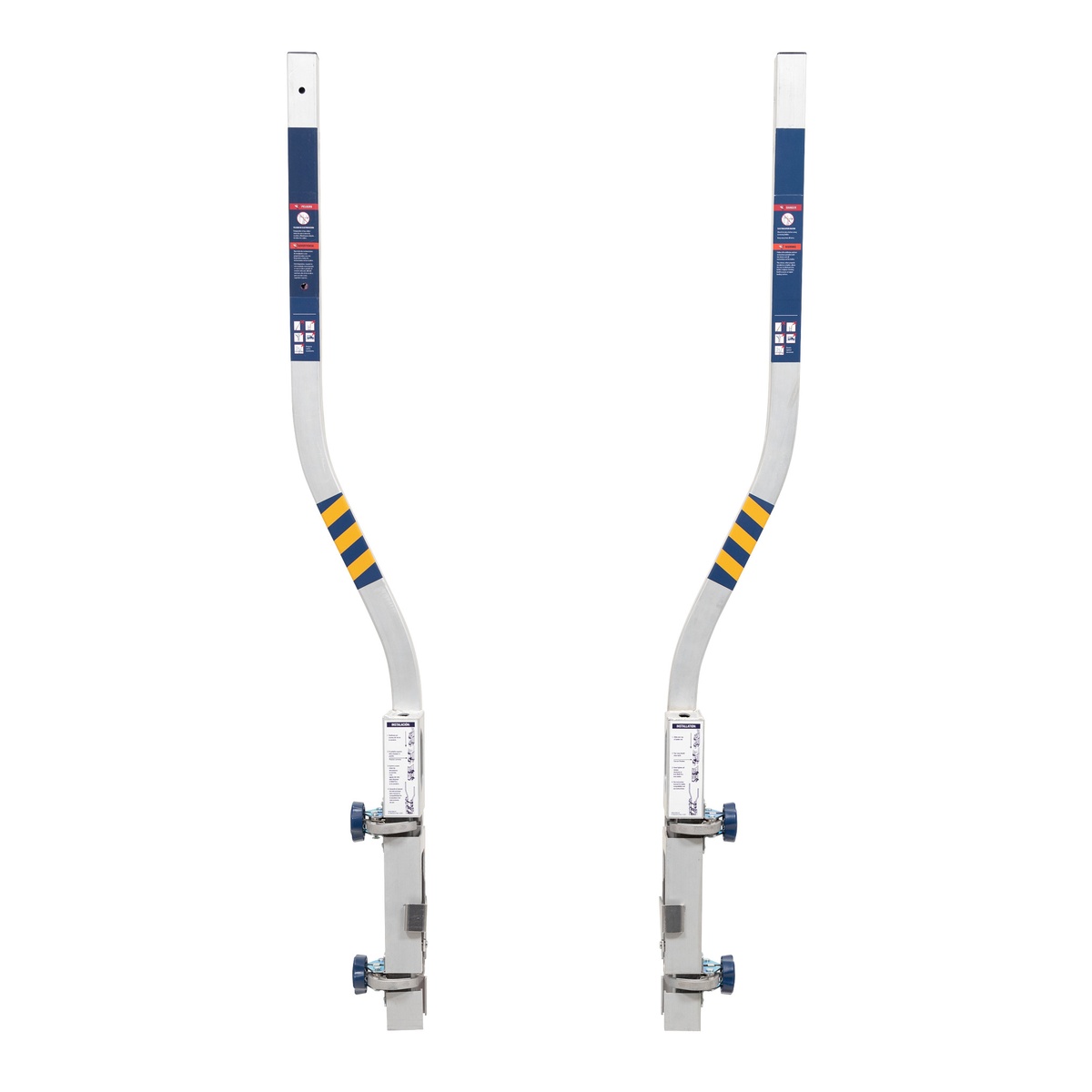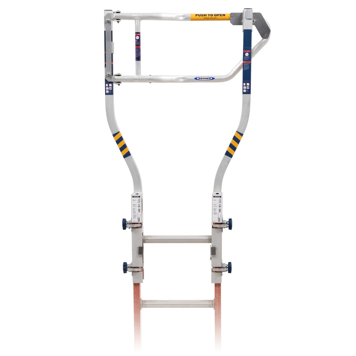The WalkThru accessory enhances safety and stability when stepping on or off roofs or platforms. It is compatible with Werner extension ladders from Type II to Special Duty Type IAA and fits rail/end cap dimensions between approximately 0.5?1.375 in wide and 3?3.5 in deep. A dual clamping system locks the rail extensions to the ladder rails, while a wide base provides added contact area on the work surface during transitions. A ladder rung latch spring mechanism holds securely, with high-visibility caution markings. Meets OSHA 1910 & 1926.